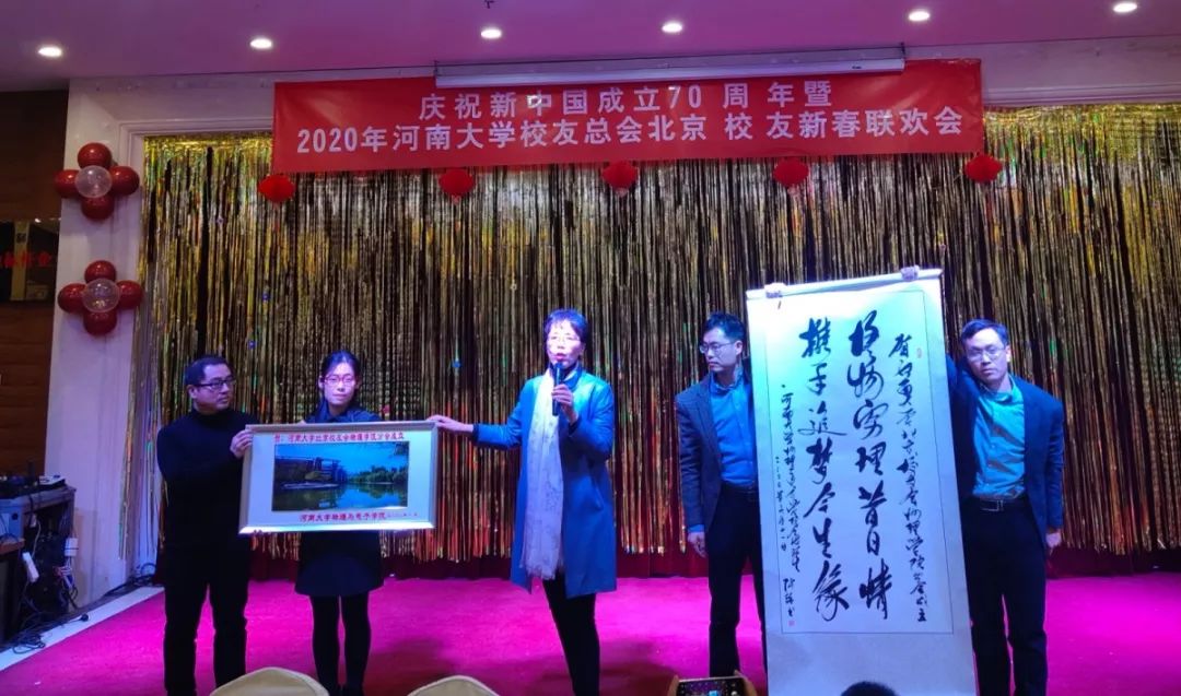 王宏华代表物理与电子学院向分会赠送“格物穷理昔日情 携手追梦今生缘”书法作品和学院“琴键楼·镜如湖”照片。她简要介绍了学院目前的发展情况,感谢广大校友多年来对物理学院发展的关心支持和大力帮助。她诚挚邀请校友们多回家看看,希望广大校友一如既往地关心和支持学院的发展,为学院发展建言献策、添砖加瓦,继续为母校“双一流”大学建设做出更加积极的贡献。