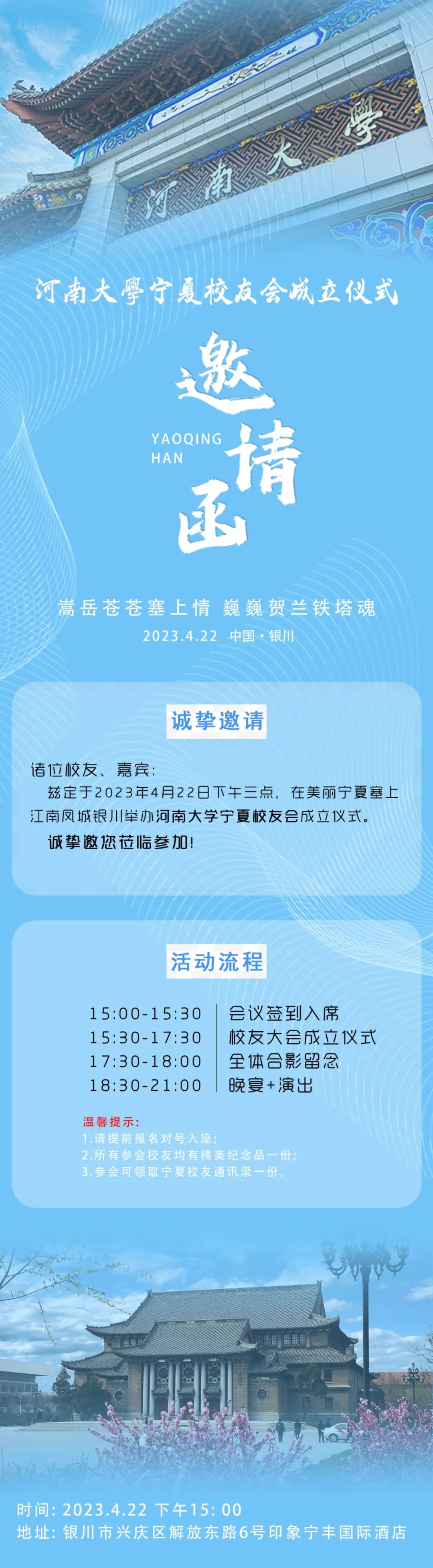 在此,宁夏校友会筹备组的全体成员诚挚地向各位校友及关心河南大学发展的社会各界人士发出邀请,让我们相约“塞上江南,神奇宁夏”,共同见证这一重要时刻,再叙校友情,同谱新篇章!