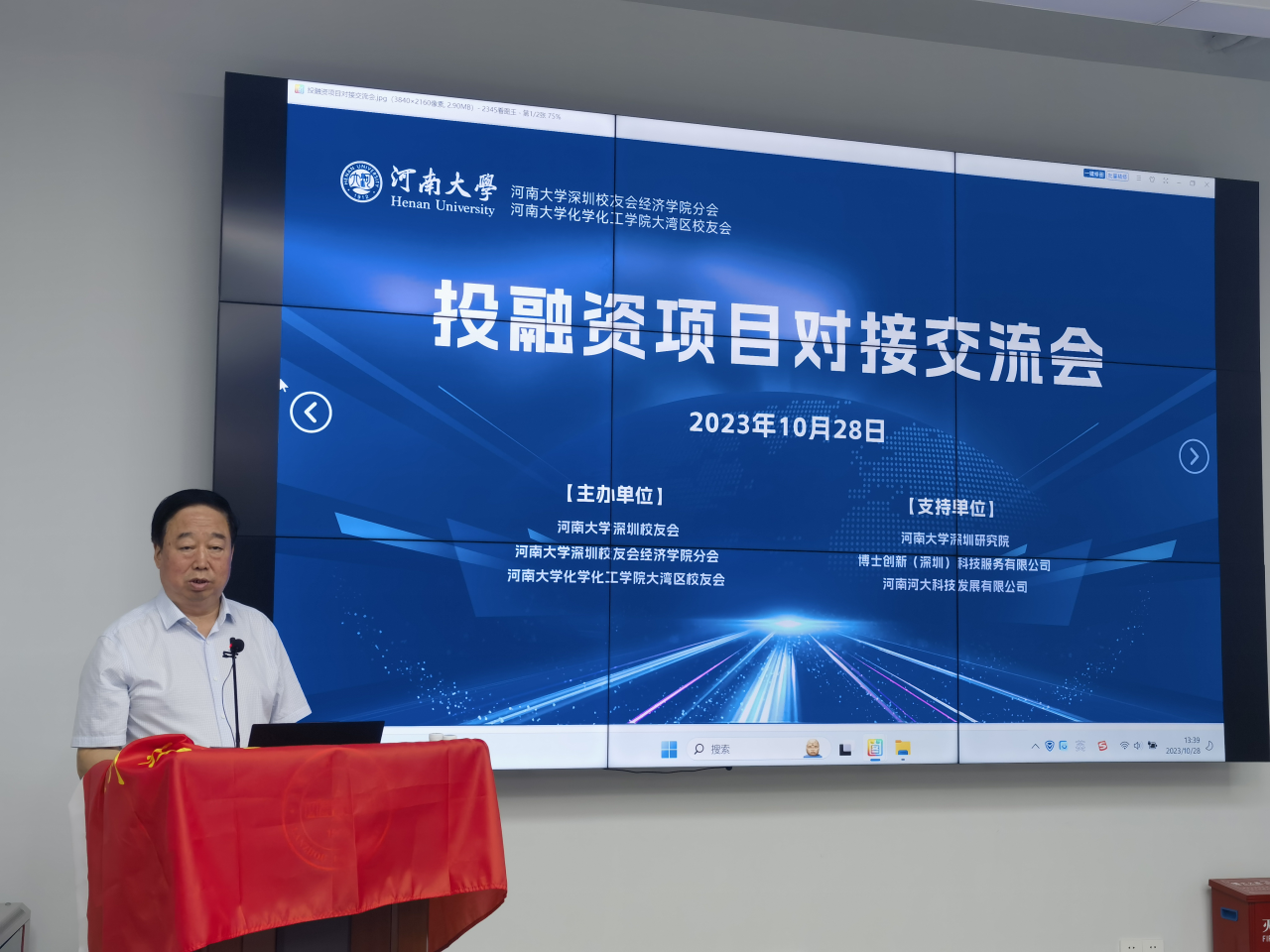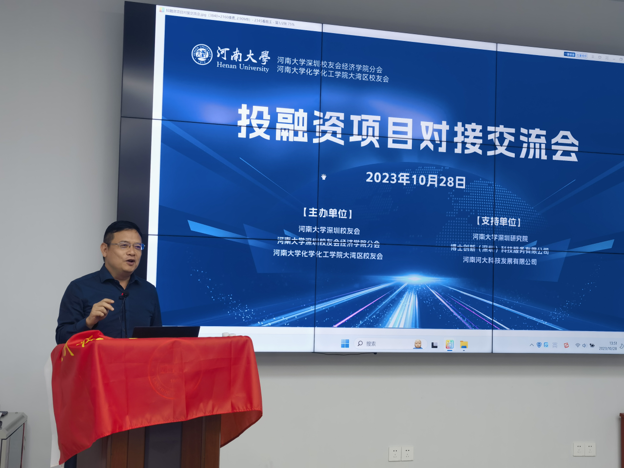 10月28日下午,由河南大学深圳校友会、经济学院分会、化学化工学院大湾区校友会联合主办的“投融资项目对接交流会”在深圳虚拟大学园产业化基地举办。活动吸引9家创投机构和6个路演项目团队参与。河南大学党委常委、副校长、校友总会副会长许绍康,河南大学深圳校友会会长、深圳东方港湾投资管理股份有限公司董事长但斌,河南大学校友工作与教育发展基金会办公室主任、校友总会秘书长刘会军,河南大学深圳校友会名誉会长、深圳研究院创院院长牛利民,深圳校友会副会长、深圳研究院副院长周大鹏,深圳校友会副会长、经济学院分会会长王汉卿,经济学院党委书记程金辉、副书记翟志远及校友60余人出席活动。经济学院分会秘书长姬文秀主持会议。