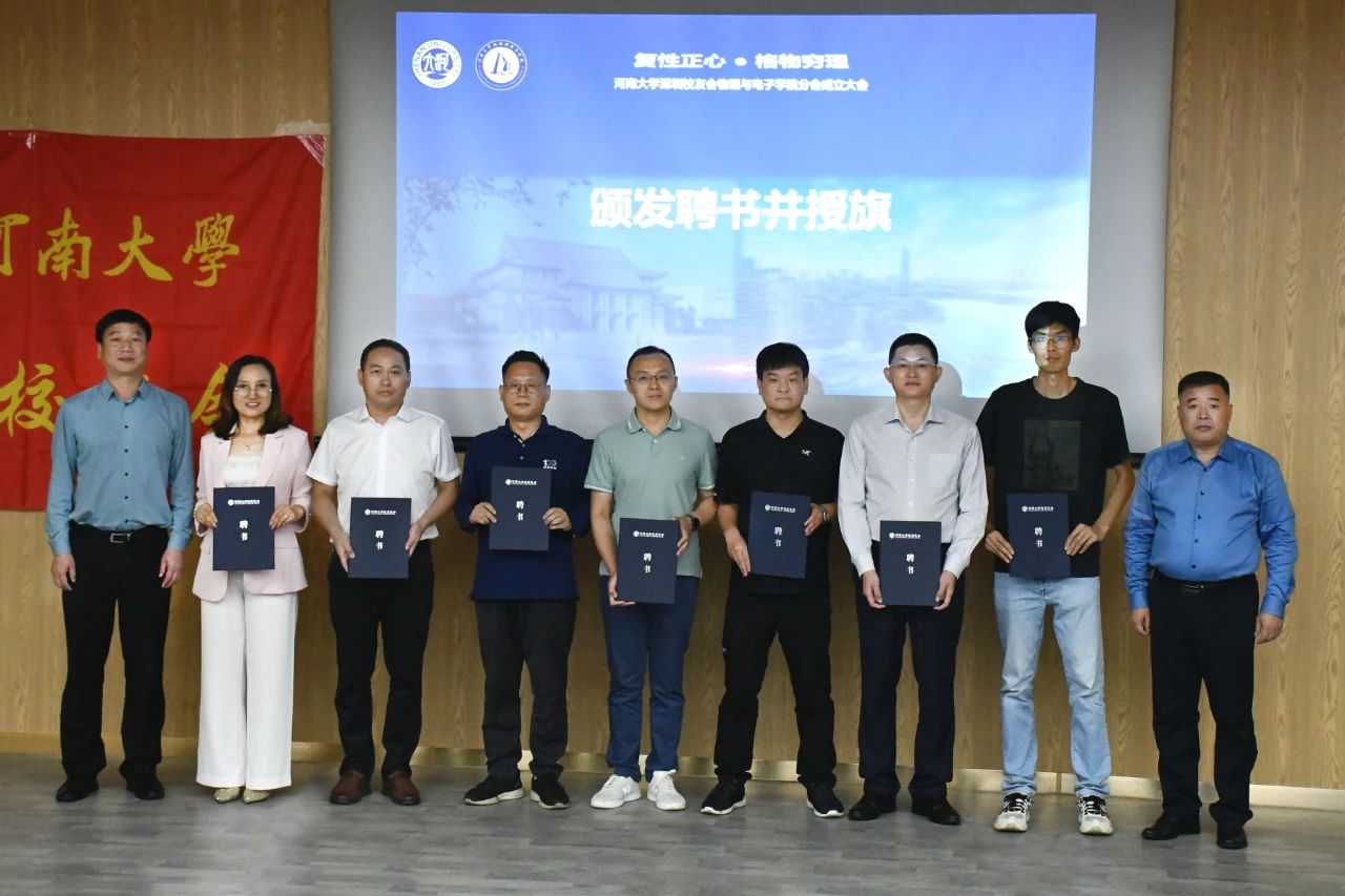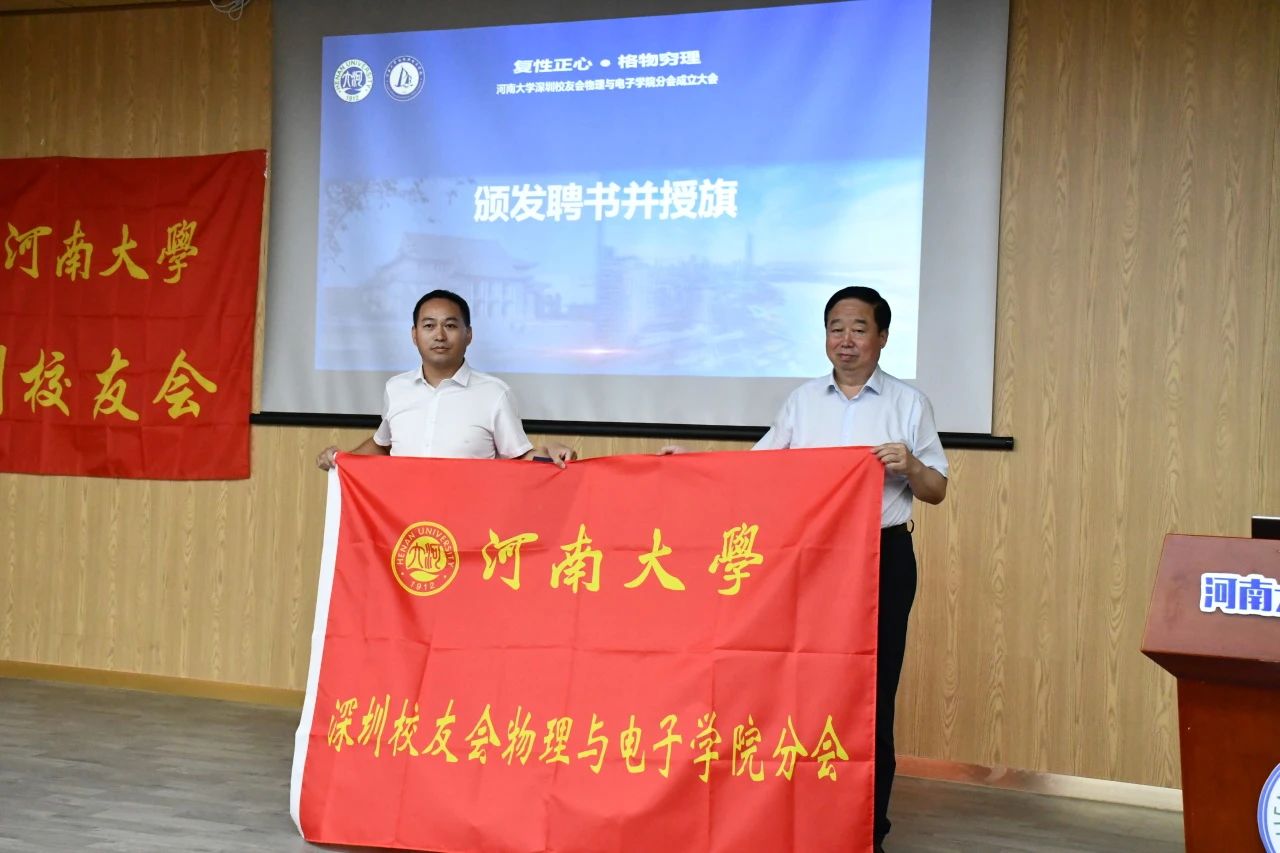 许绍康为河南大学深圳校友会物理与电子学院分会授旗,并为分会首届会长颁发聘书。刘会军、张慧共同为分会首届理事会人员颁发聘书。