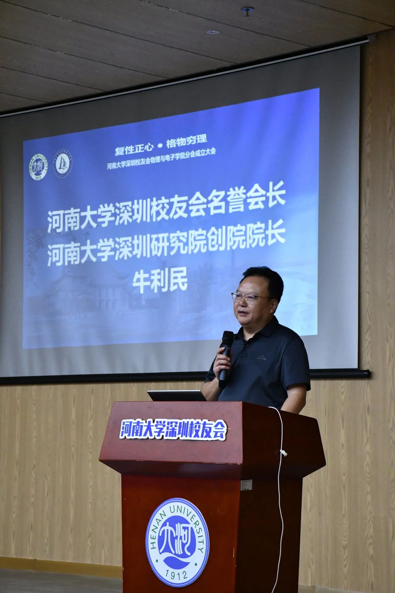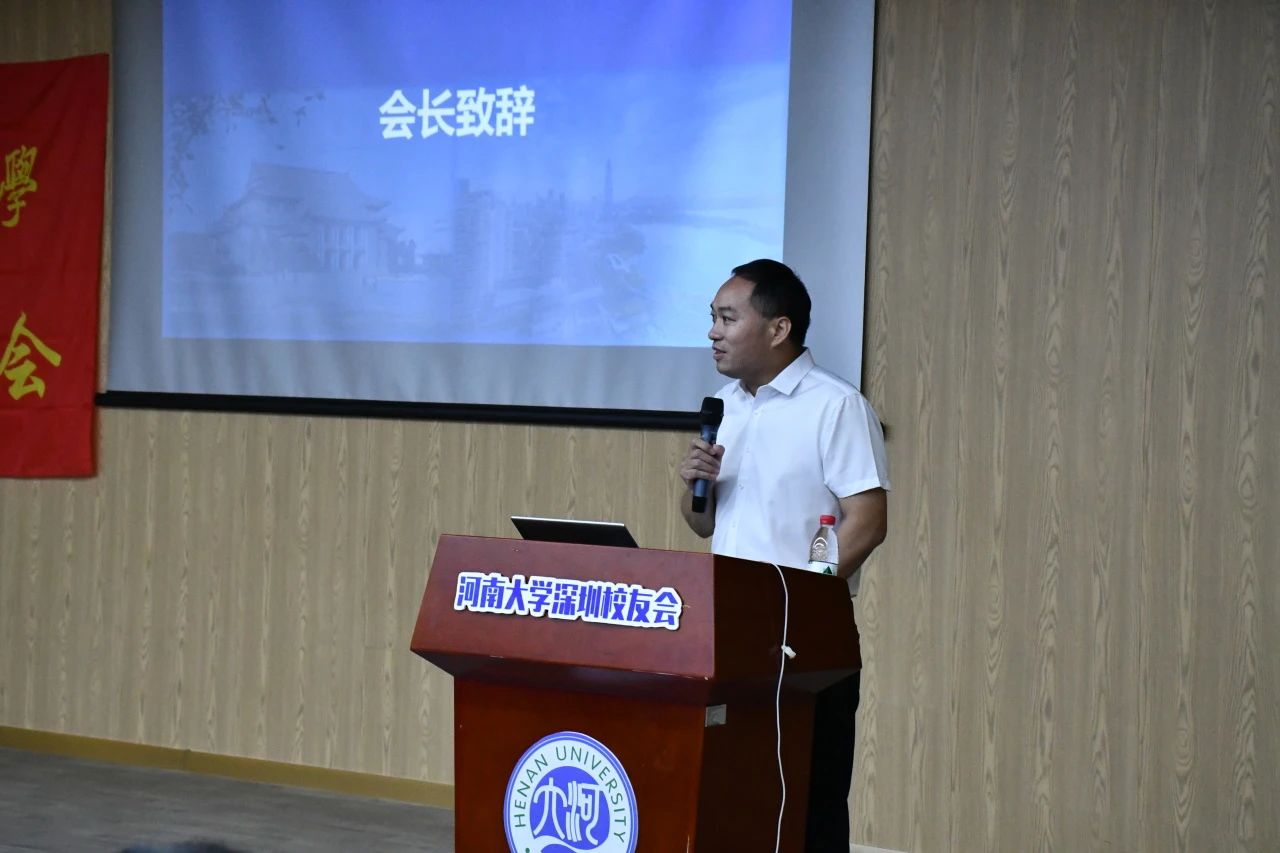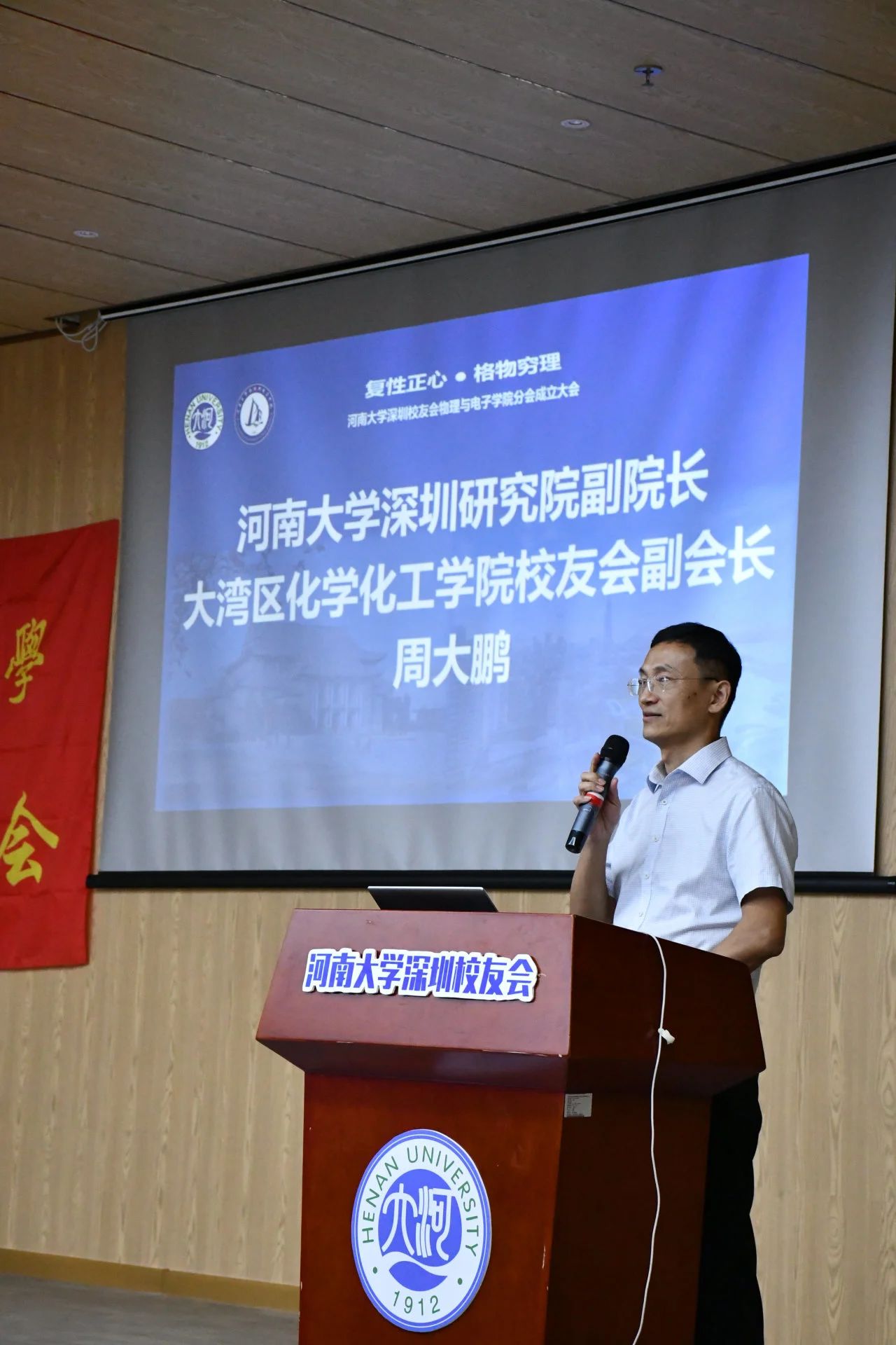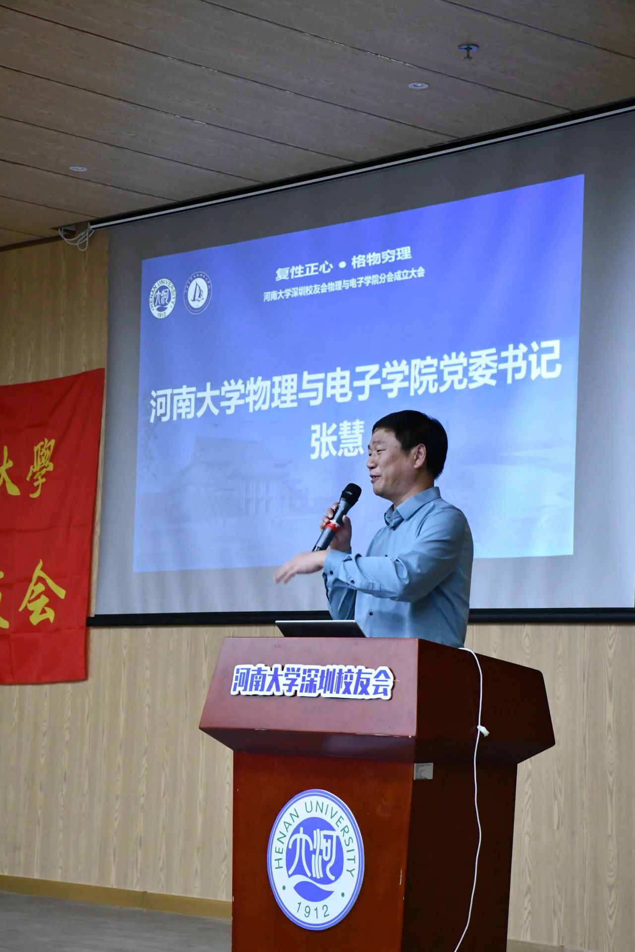 张慧向与会校友介绍了河南大学物理学科的百年发展历程,他表示,深圳校友会物理与电子学院分会的成立,正逢河南大学物理学科创建100周年,有着特别的纪念意义。一百年来,河南大学物理学科坚持以“建一流学科、育一流人才”为办学目标,培养出一批批在各行各业发挥专业优势,作出卓越贡献的河大物理人。希望在深物理与电子学院校友恪守“明德新民,止于至善”的校训和“复性正心,格物穷理”的院训,志存高远、追求卓越、努力拼搏,在深圳这个改革开放前沿的城市,充分发挥河大物理人的智慧和学识,开辟新天地,创造新价值,努力谱写人生的华彩乐章,为母校的“双一流”建设和母院高质量发展作出新的贡献。