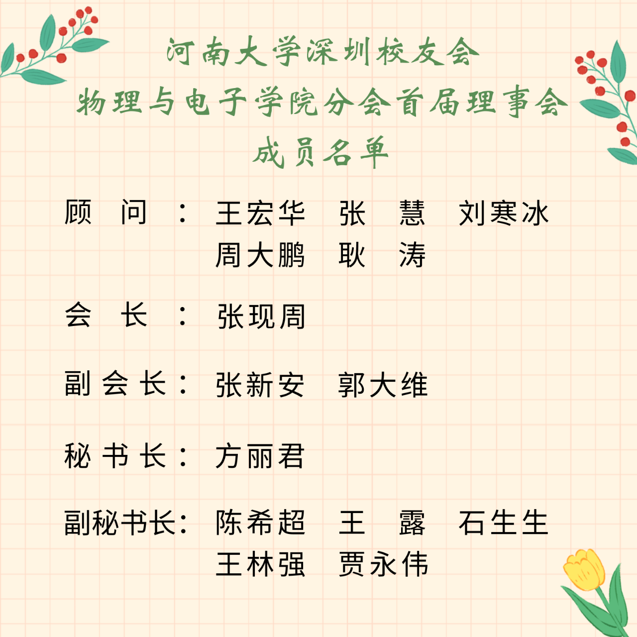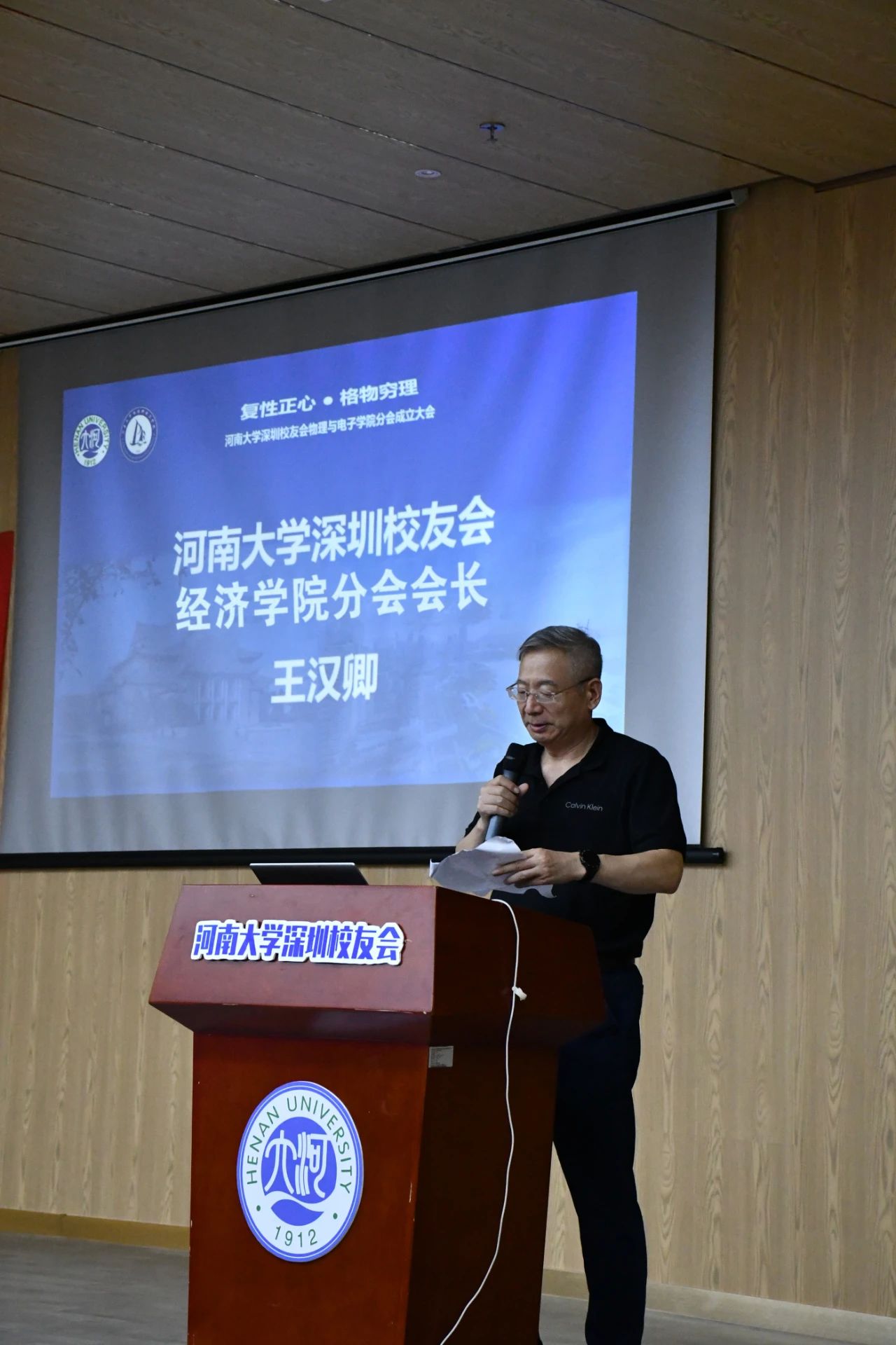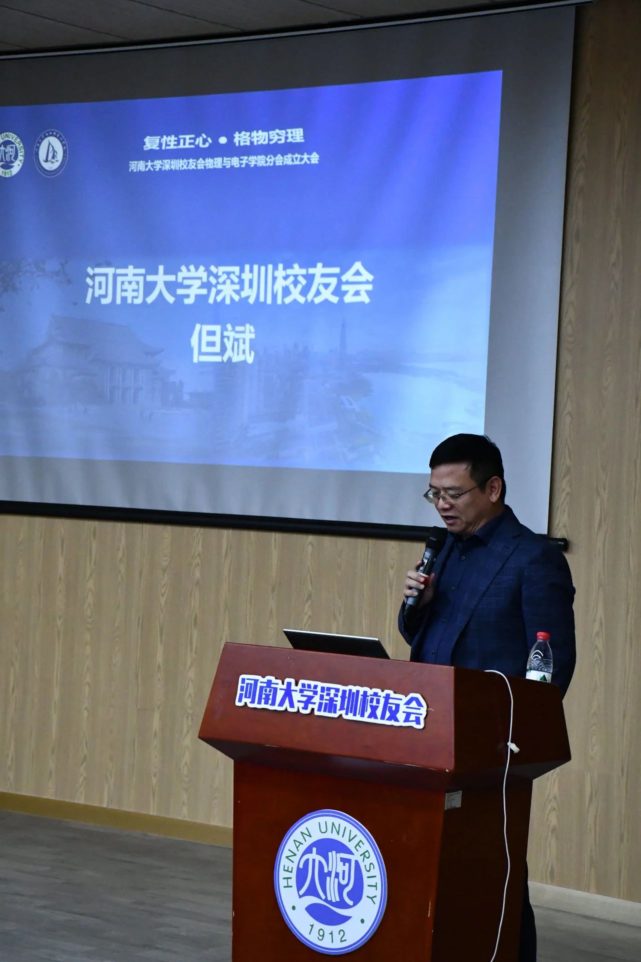 秋高气爽,丹桂飘香。10月28日,河南大学深圳校友会物理与电子学院分会成立大会在深圳虚拟大学园产业化基地一楼报告厅举行。河南大学党委常委、副校长、校友总会副会长许绍康,河南大学深圳校友会会长、深圳东方港湾投资管理股份有限公司董事长但斌,河南大学校友总会秘书长刘会军,河南大学深圳校友会名誉会长、深圳研究院创院院长牛利民,河南大学深圳校友会经济学院分会会长王汉卿,河南大学深圳研究院副院长、深圳校友会副会长、化学化工学院“大湾区”校友会副会长周大鹏,河南大学物理与电子学院党委书记张慧,河南大学校友总会副秘书长骆春丽,河南大学物理与电子学院党委副书记刘寒冰、副院长刘名果及物理与电子学院在深校友代表出席成立大会。物理与电子学院2006级校友王露主持大会。
