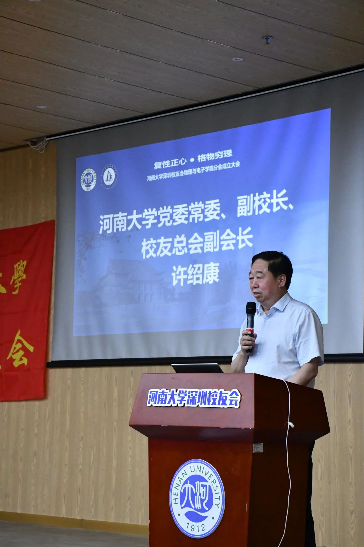 许绍康代表河南大学向参与并出席此次成立大会的来宾及各界人士表示诚挚的欢迎,对关心和支持学校、学院发展的在深校友表示衷心的感谢。他强调,在河南省委、省政府的殷切关注和支持下,学校目前已迈入“双一流”“双航母”战略叠加的黄金时期,发展进入快车道。全校师生齐心协力,紧紧围绕“中国特色、世界一流、中原风格”的发展定位,在人才与师资队伍建设、学科建设、人才培养、招生就业等方面都做出了卓有成效的工作。许绍康表示,在河南大学的百十年辉煌办学路和物理学科的百年发展历程中,校友永远是母校最宝贵的财富和资源,是母校事业发展最坚实最可信赖的力量。希望深圳校友会物理与电子学院分会能够积极发挥桥梁纽带作用,传承母校文化,增加母校美誉度;利用珠三角的丰富资源,搭建校友沟通交流、资源共享的平台,在人才培养、招生就业、高层次人才引进和学科建设上发挥作用,助推母校“双一流”建设和物理学科蓬勃发展。