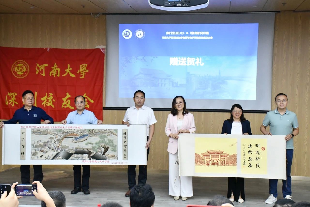 骆春丽、刘寒冰为河南大学深圳校友会物理与电子学院分会赠送贺礼。会上还收到了来自河南大学北京校友会、上海校友会、浙江校友会、山东校友会、山西校友会、苏州校友会、平顶山校友会、北京校友会物理与电子学院分会、上海校友会物理与电子学院分会等校友(分)会的祝贺视频及贺信。