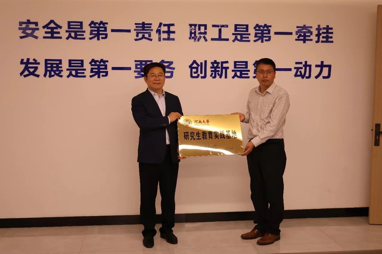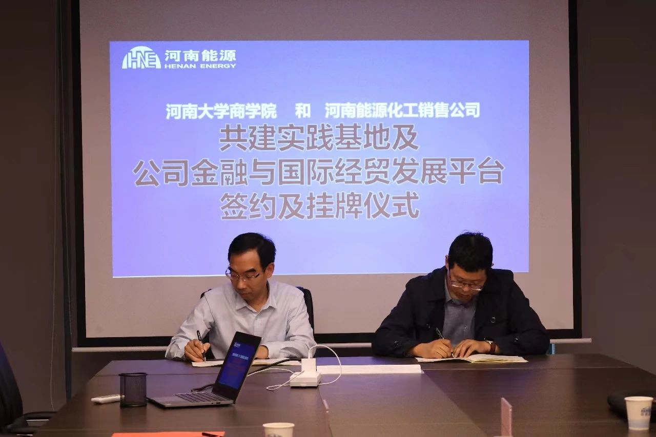 左辞波代表商学院向集团授予了研究生教育实践基地牌匾,李耀代表商学院与河南能源集团化工销售有限公司签订研究生教育实践基地协议。