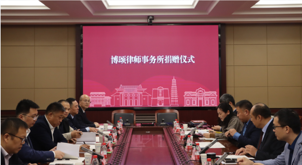 11月4日上午,河南博颂律师事务所向河南大学教育发展基金会捐赠仪式在明伦校区法学院第一会议室举行。河南大学法学院2014级校友、河南博颂律师事务所主任武中文,河南博颂律师事务所支部书记张海莲、副主任和瑞娟,河南大学教育发展基金会秘书长刘会军,法学院党委书记祝晓路、副院长刘夏、王利、研科办主任古戴及部分师生参加了捐赠仪式。仪式由法学院副院长吴瑷瑷主持。