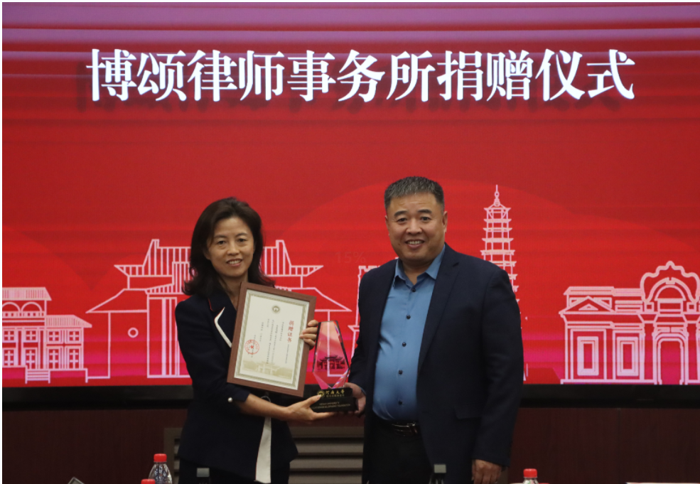 仪式上,刘会军代表学校教育发展基金会与博颂律师事务所代表武中文签订捐赠协议,并向捐赠方代表张海莲颁发捐赠证书和纪念杯。祝晓路代表法学院接受捐赠。