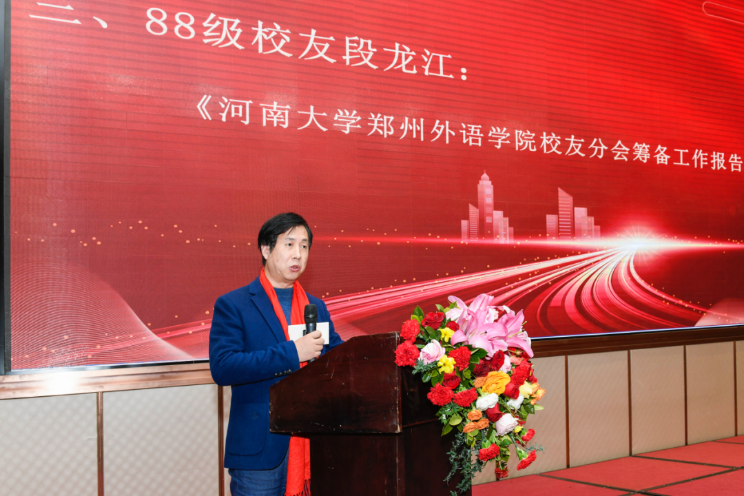 特邀嘉宾郑邦山、娄源功、程传兴、苏福功、杨玮斌分别致辞。郑邦山肯定了河南大学外语学院为河南高等教育发展做出的突出贡献,向河南大学外语学院郑州校友分会的成立表示祝贺,他鼓励学院继续提升学科建设水平、引育高质量人才,争取获得更好成绩。娄源功指出,外语学院与河南大学同岁,历史悠久、大师云集,希望分会切实架起校友之间沟通的桥梁,成为广大校友精神的家园、心灵的港湾。程传兴、苏福功、杨玮斌为河南大学外语学院郑州校友分会的成立送上真挚的祝福。