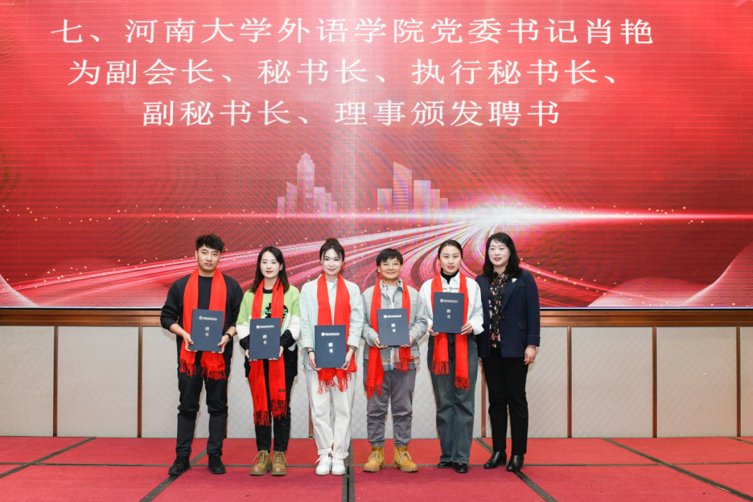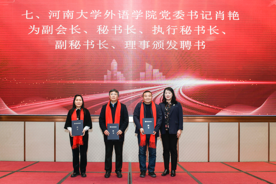 河南大学外语学院党委书记肖艳向分会副会长、秘书长、执行秘书长、副秘书长、理事颁发聘书。