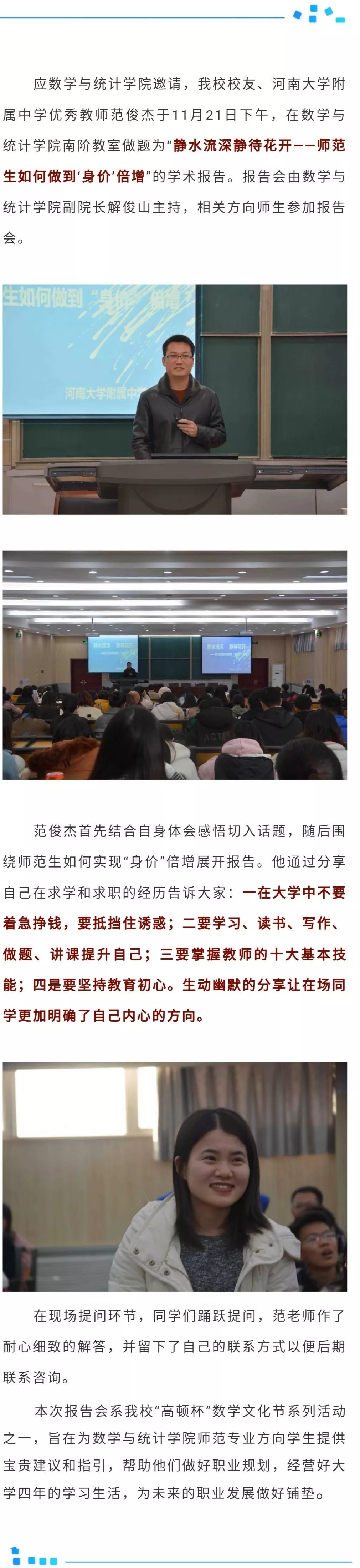 范俊杰:数学与统计学院2013级研究生,河南大学附属中学教师、班主任,河南省名班主任工作室主持人,“星驰德育讲师团”核心讲师,河南省优秀班主任,开封市优秀班主任,全国优质课大赛一等奖获得者,河南省优质课大赛一等奖获得者。