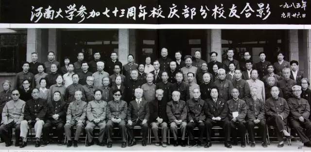 1985年学校举行建校73周年庆祝活动,活动中来自各地的部分校友在办公楼前合影留念。其中在前排正中就座的是:1935年的校长许心武(正中)、著名生物学家王鸣岐(右七)、著名作家姚雪垠(左七)、著名教育家李秉德(右六)、时任省委宣传部长的侯志英(左六)等。这张珍贵的留影,记录了大半个世纪的校友情,有人称其为:河南大学第一幅9.25校庆大合影。