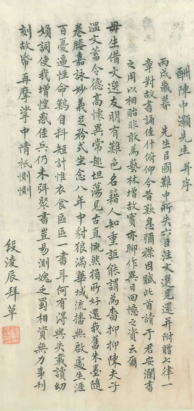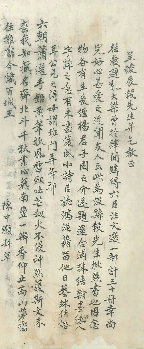抗战胜利,河大复校。一日,文友杨子固来访。杨时任教河南大学,识得《文选》的朱批点评乃河大段凌辰教授的手迹墨宝。陈中灏当即决定派家人将珍藏多年的珍贵刻本归还失主,并随函附七律一首《呈凌辰段先生并乞教正》: