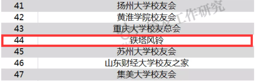近日,在“校友工作研究”公众号公布的“2020高校校友会公众号100强榜单”中,微信公众号“铁塔风铃”入围全部奖项 ,分别为:最佳全能榜:37名、最具传播力榜:44名、最受欢迎榜:33名、最勤奋榜:53名。
