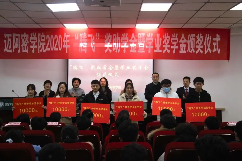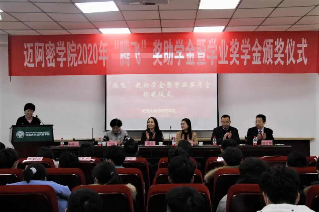12月28日下午,河南大学2020年“腾飞”奖助学金暨学业奖学金颁奖仪式在迈阿密学院二楼报告厅举行。郑州腾飞建工集团有限公司人力资源总监王倩,校党委常委、副校长谭贞,教育发展基金会、学校相关职能部门负责人应邀出席仪式,学院班子全体成员、师生代表200余人参加。仪式由学院党总支书记杨彩云主持。