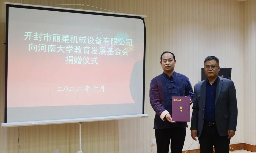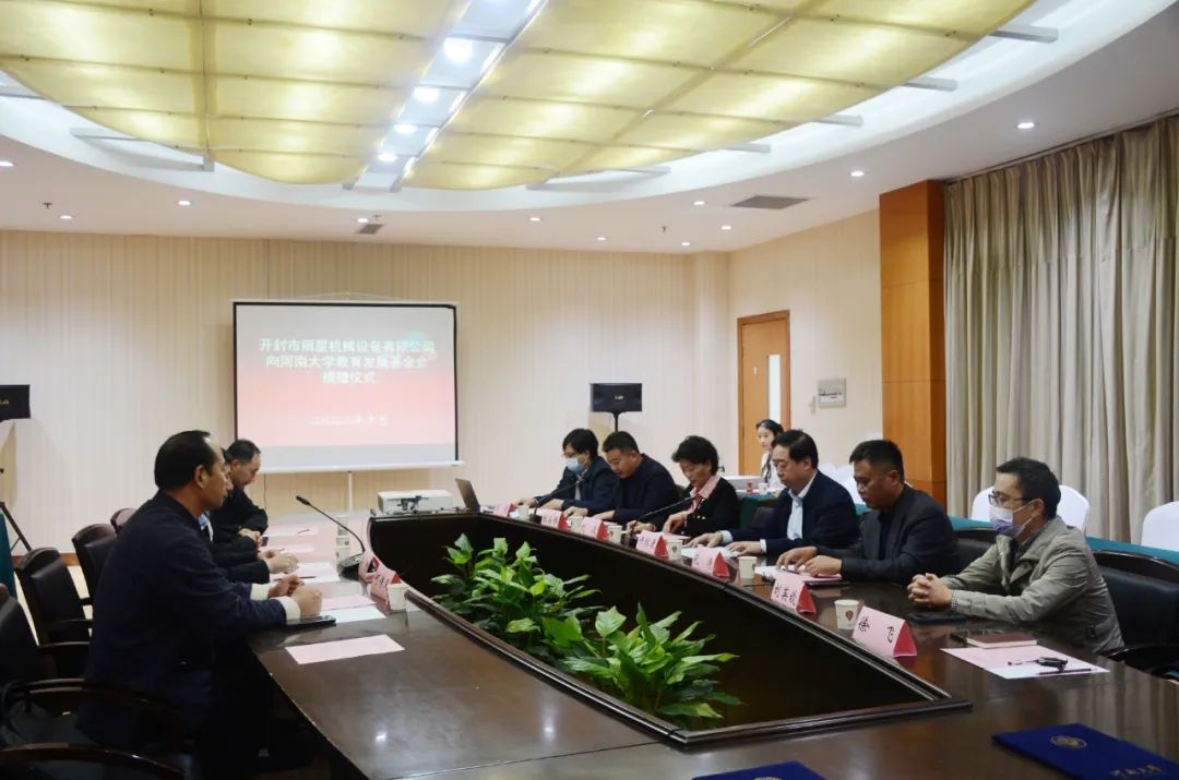 10月19日,开封市丽星机械设备有限公司向河南大学教育发展基金会捐赠仪式在河南大学金明校区举行,开封市丽星机械设备有限公司捐赠10万元,用于河南大学王惟一文化传承大学生创新创业大赛。开封市丽星机械设备有限公司总经理孙刚,中医非遗传承人何传义先生,河南大学党委常委、副校长、基金会副理事长许绍康,河南大学教育发展基金会秘书长刘波,人文社科研究院院长桓占伟,文化产业与旅游管理学院党委书记孔涛以及学校教育发展基金会、人文社科研究院、文化产业与旅游管理学院相关负责人参加了仪式。