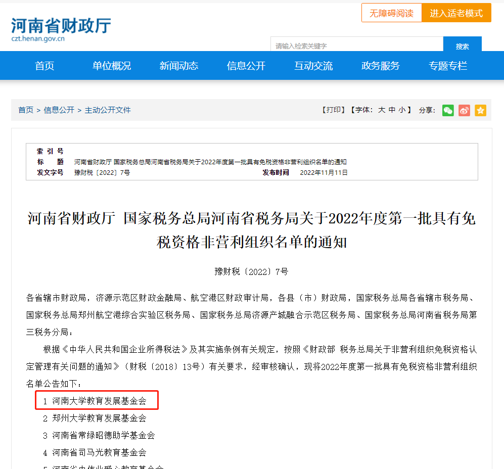 2022年11月11日,河南省财政厅、国家税务总局河南省税务局发布豫财税〔2022〕7号文件,公布了2022年度第一批具有免税资格非营利组织名单,河南大学教育发展基金会名列其中,获得2022-2026年5年非营利组织免税资格。
