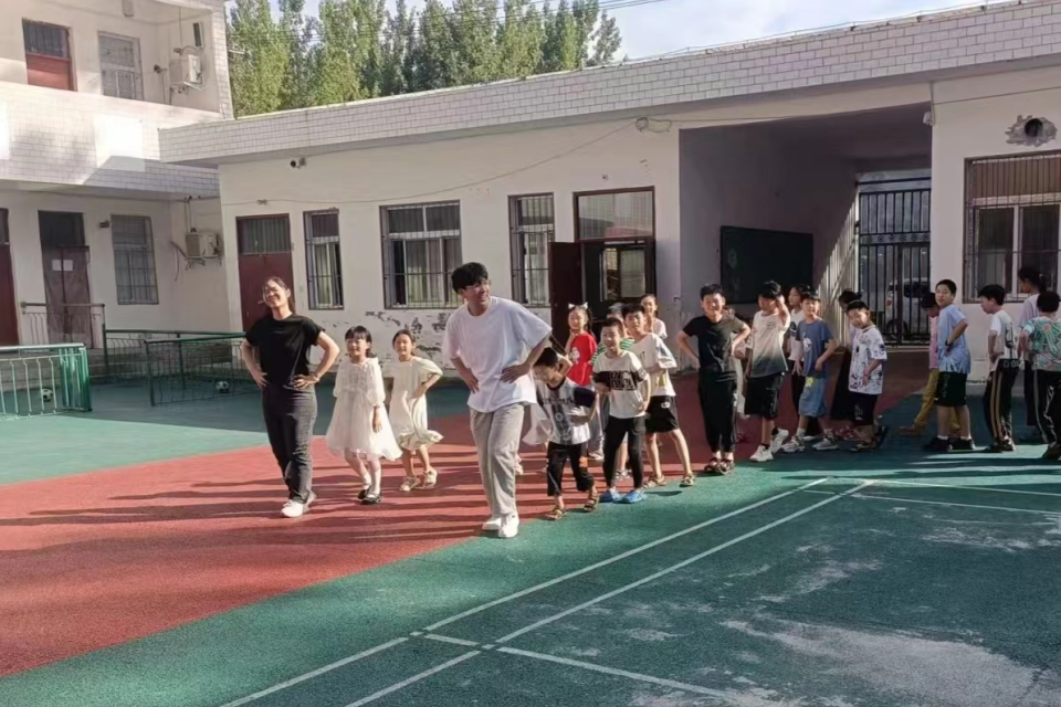 下课后,他们则化身贴心的大哥哥、大姐姐,和孩子们一起跳绳、踢毽子,一起扔沙包、打羽毛球,一起踢足球、拍篮球……一时之间,追逐声、嬉戏声,打闹声、欢笑声,响彻整个校园。