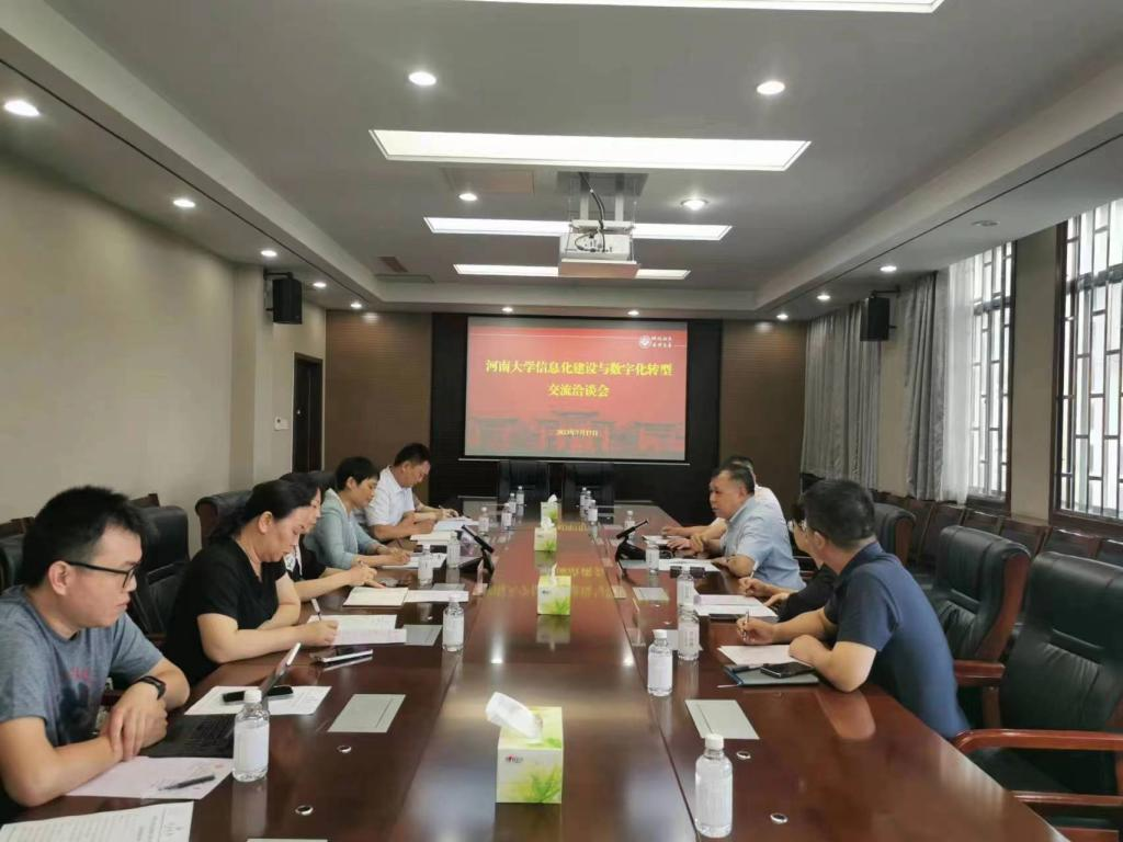 为加快推进河南大学信息化建设,7月17日下午,河南大学信息化管理办公室联同赛尔网络有限公司在金明校区行政楼308会议室举办信息化建设与数字化转型交流洽谈会。CERNET国家网络中心主任助理、赛尔网络有限公司副总裁付晓东和赛尔网络有限公司河南分公司总经理李路路等一行四人,河南大学党委副书记冯淑霞,信息化管理办公室副主任李媛和各科室负责人,参加了本次洽谈会。会议由信息化管理办公室副主任赵艳忠主持。