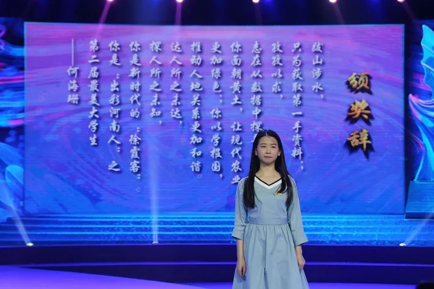 青春与时代相辉映,青年与祖国同奋进。为纪念五四运动100周年,继承和弘扬“五四”精神,树立和宣传青春榜样,引领青年茁壮成长,为奋力推进教育高质量发展,中原更加出彩贡献力量,2019年4月27日晚,“出彩河南人”之第二届最美大学生颁奖典礼在河南广播电视台举行,我校环境与规划学院学生何海珊获此殊荣。校党委常委、副校长孙功奇应邀参加了颁奖典礼。